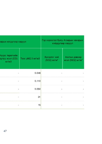 Хүхэрлэг хий Азотын давхар дутуу исэл (CO) Тоос pM2.5 мг/м3 Хүхэрлэг хий Азотын давхар